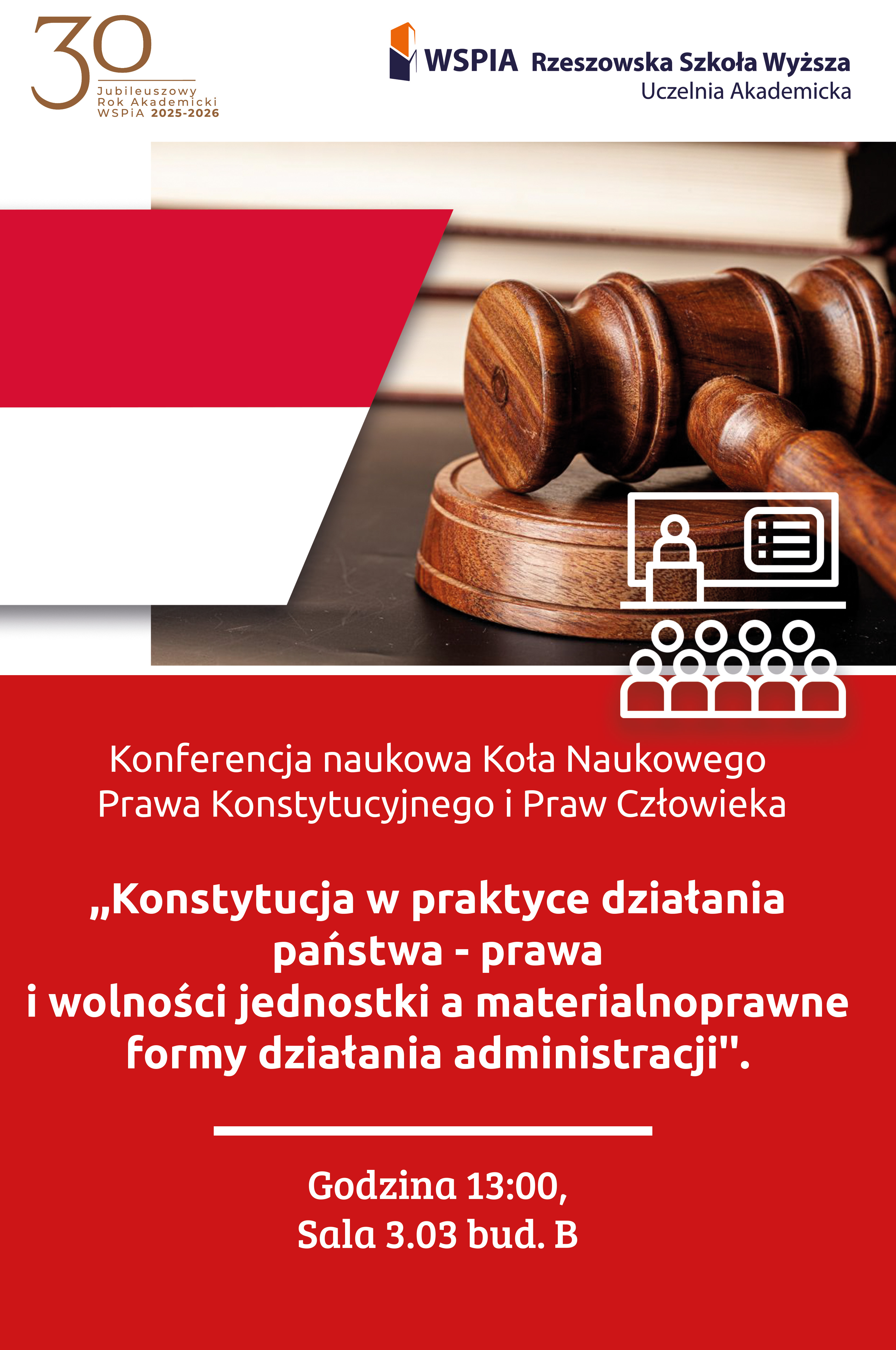- Konferencja Naukowa "Konstytucja w praktyce działania państwa - prawa i wolności jednostki a materialnoprawne formy działania administracji", organizowana przez Koło Naukowe Konstytucyjne. Godzina 13:00, Sala 3.03, bud. B.