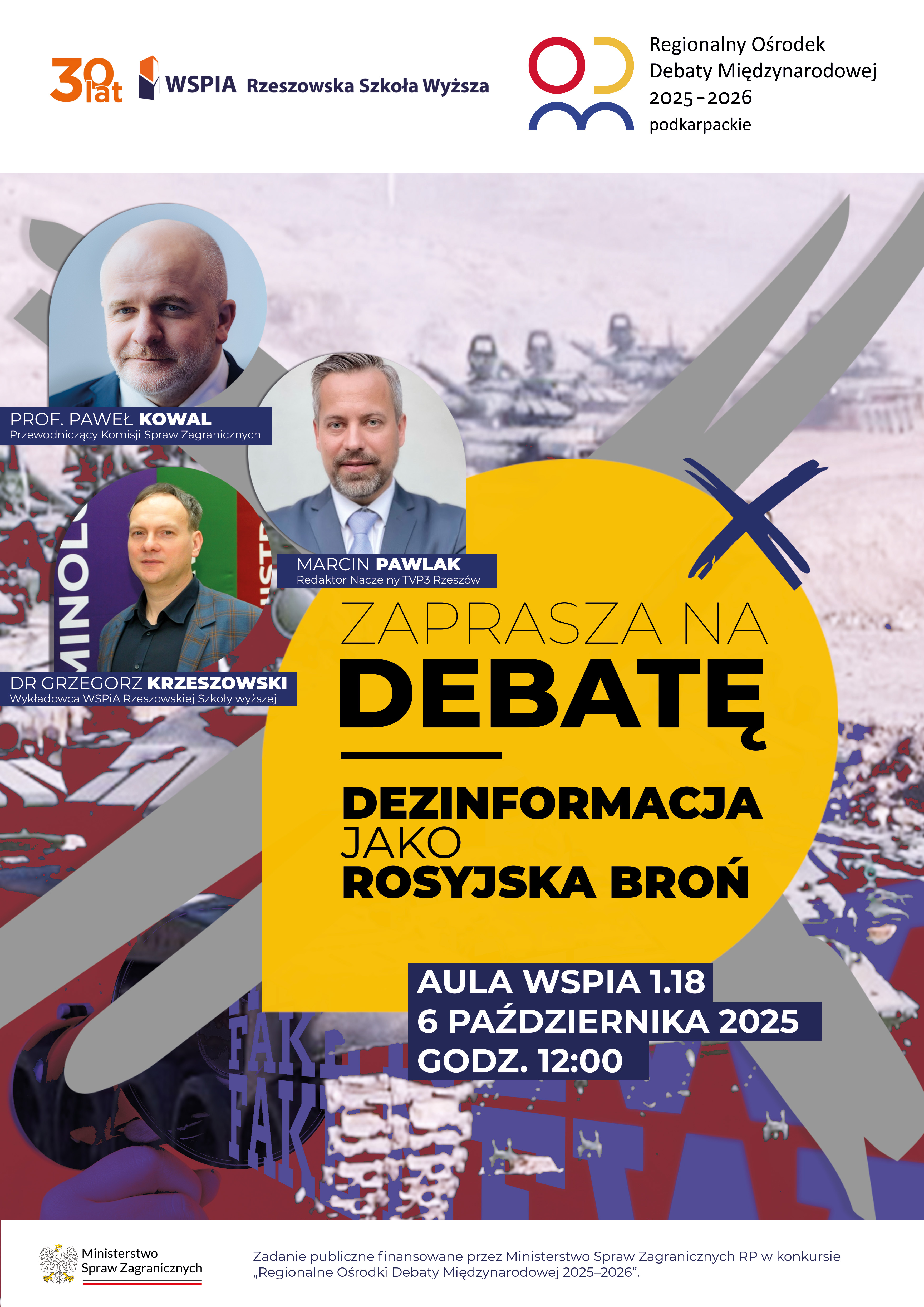 Regionalny Ośrodek Debaty Międzynarodowej 2025-2026 – Podkarpackie zaprasza na debatę „Dezinformacja jako rosyjska broń”. W debacie uczestniczyć będą: prof. Paweł Kowal – Przewodniczący Sejmowej Komisji Spraw Zagranicznych, Marcin Pawlak – Redaktor Naczelny TVP3 Rzeszów i dr Grzegorz Krzeszowski – Wykładowca WSPiA Rzeszowskiej Szkoły Wyższej.