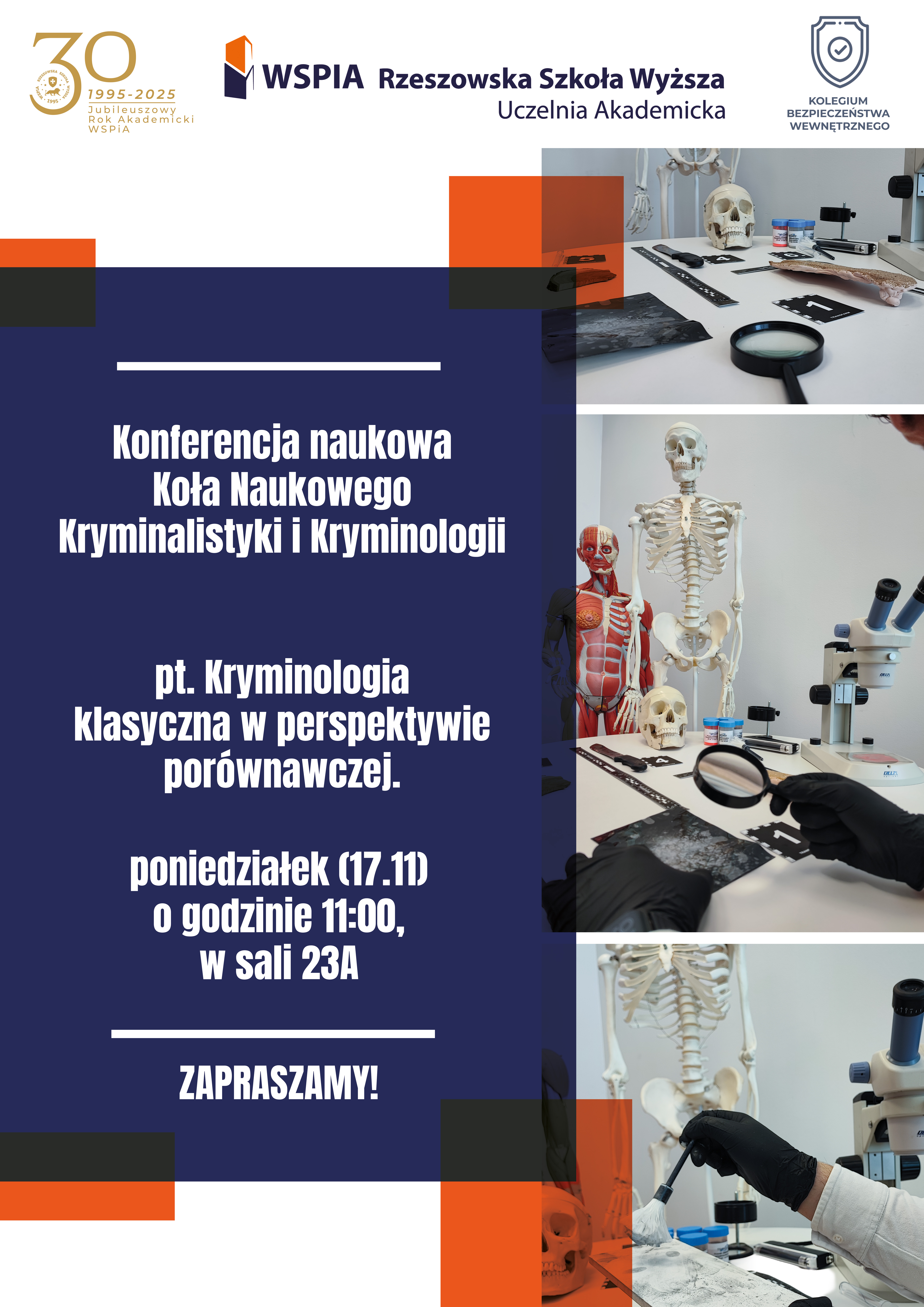 W przyszłym tygodniu zapraszamy na Konferencję Naukową Koła Naukowego Kryminalistyki i Kryminologii pt. Kryminologia klasyczna w perspektywie porównawczej. Konferencja odbędzie się o godzinie 11:00, w sali 23A.