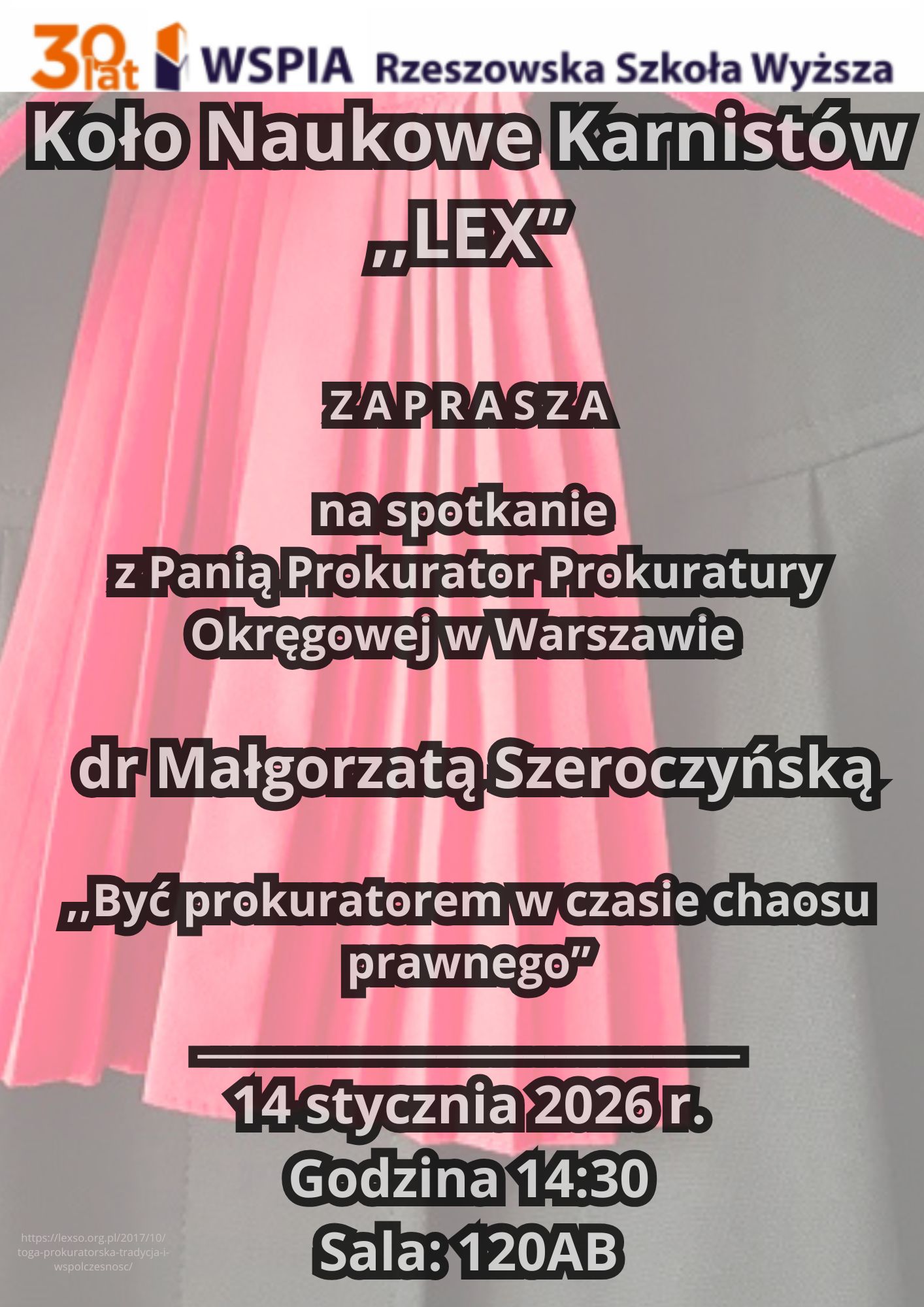 Przed nami kolejne wielkie wydarzenie pozwalające studentom WSPiA na zdobywanie wiedzy nie tylko teoretycznej, lecz także praktycznej, poprzez bezpośredni kontakt z doświadczonymi praktykami prawa. Koło Naukowe Karnistów "LEX" zaprasza na spotkanie pt. "Być prokuratorem w czasie chaosu", podczas którego zostaną omówione praktyczne i systemowe aspekty wykonywania zawodu prokuratora w kontekście współczesnych wyzwań społecznych, prawnych czy instytucjonalnych.