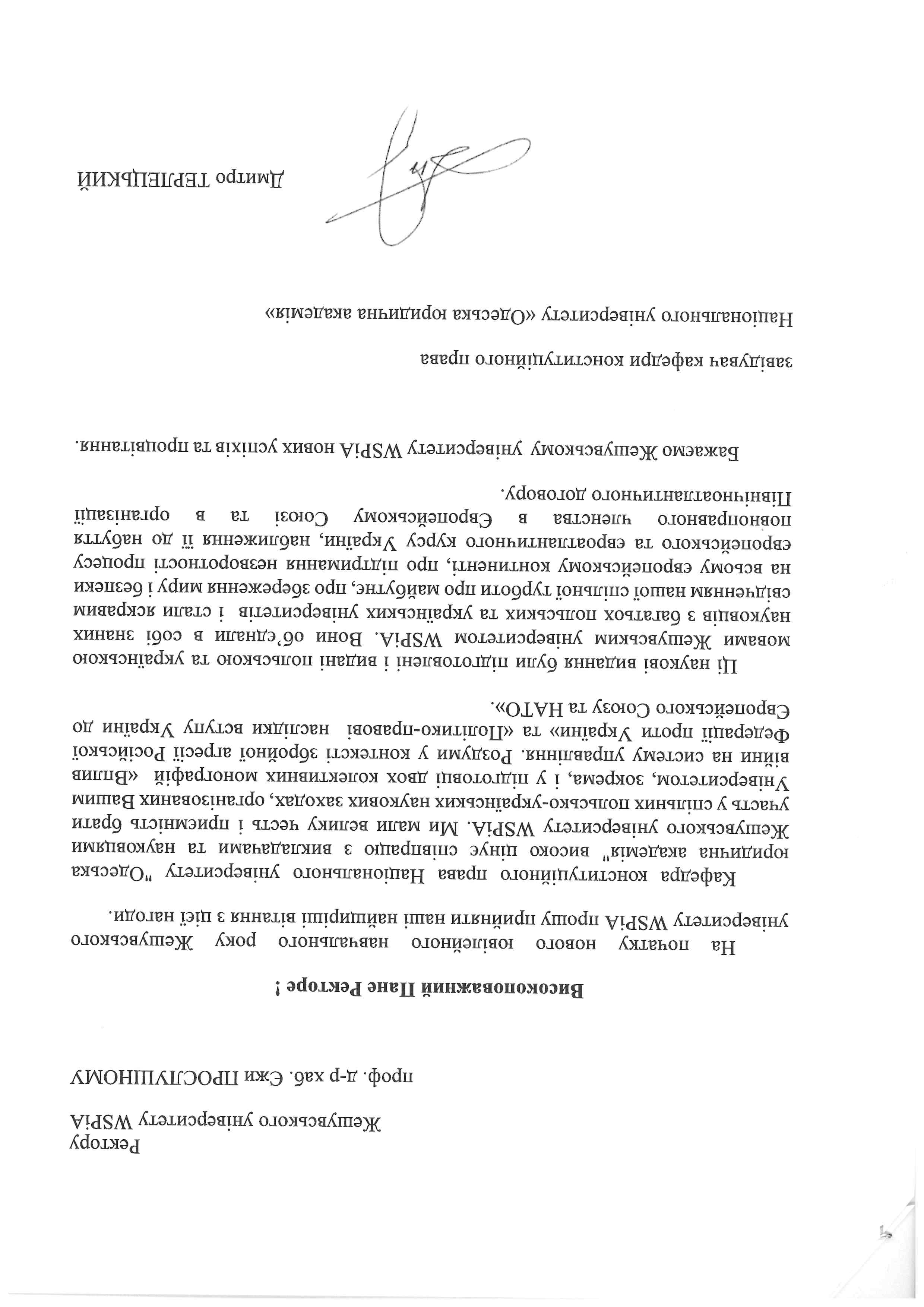 - Profesor Dymytro Terlecki – Kierownik Katedry Prawa Konstytucyjnego Narodowego Uniwersytetu Odeskiej Akademii Prawa