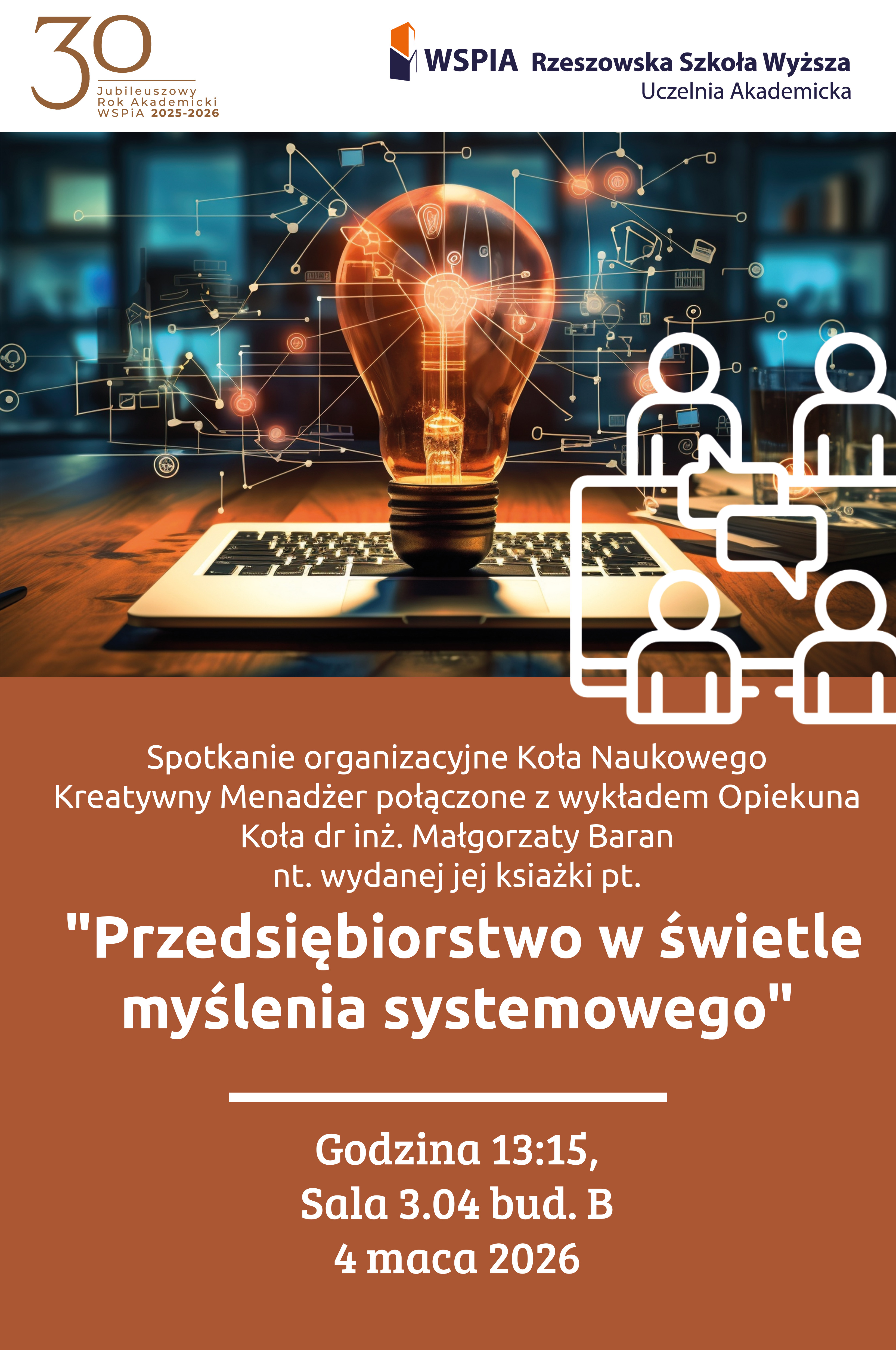 Dodatkowo 4 marca 2026 r. (środa) o godzinie 13:15 w sali 3.04 obędzie się spotkanie organizacyjne Koła Naukowego Kreatywny Menadżer połączone z wykładem Opiekuna Koła dr inż. Małgorzaty Baran na temat jej książki "Przedsiębiorstwo w świetle myślenia systemowego".