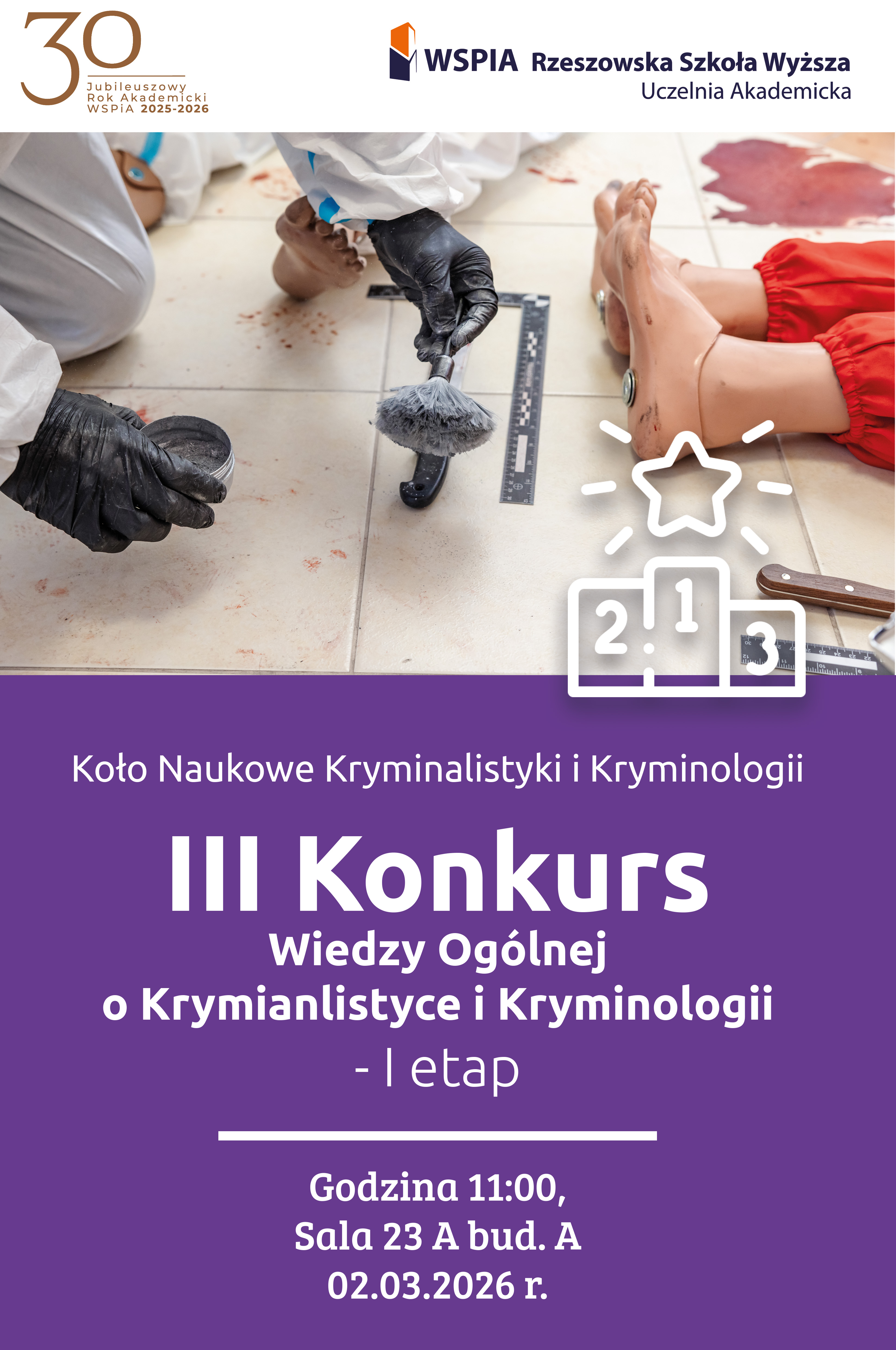 - 11:00 - III Konkurs Wiedzy Ogólnej o Kryminalistyce i Kryminologii - I etap, Sala 23A;