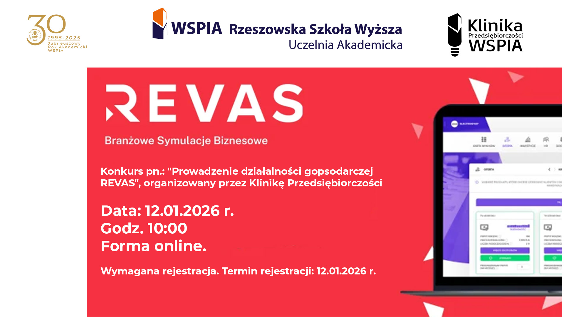 - Konkurs prowadzenia działalności gospodarczej - REVAS: 9:00 - warsztat wprowadzający do tematyki symulacji biznesowych (dla wszystkich chętnych); 10:00 - rozgrywka między zespołami (dla zgłoszonych zespołów).