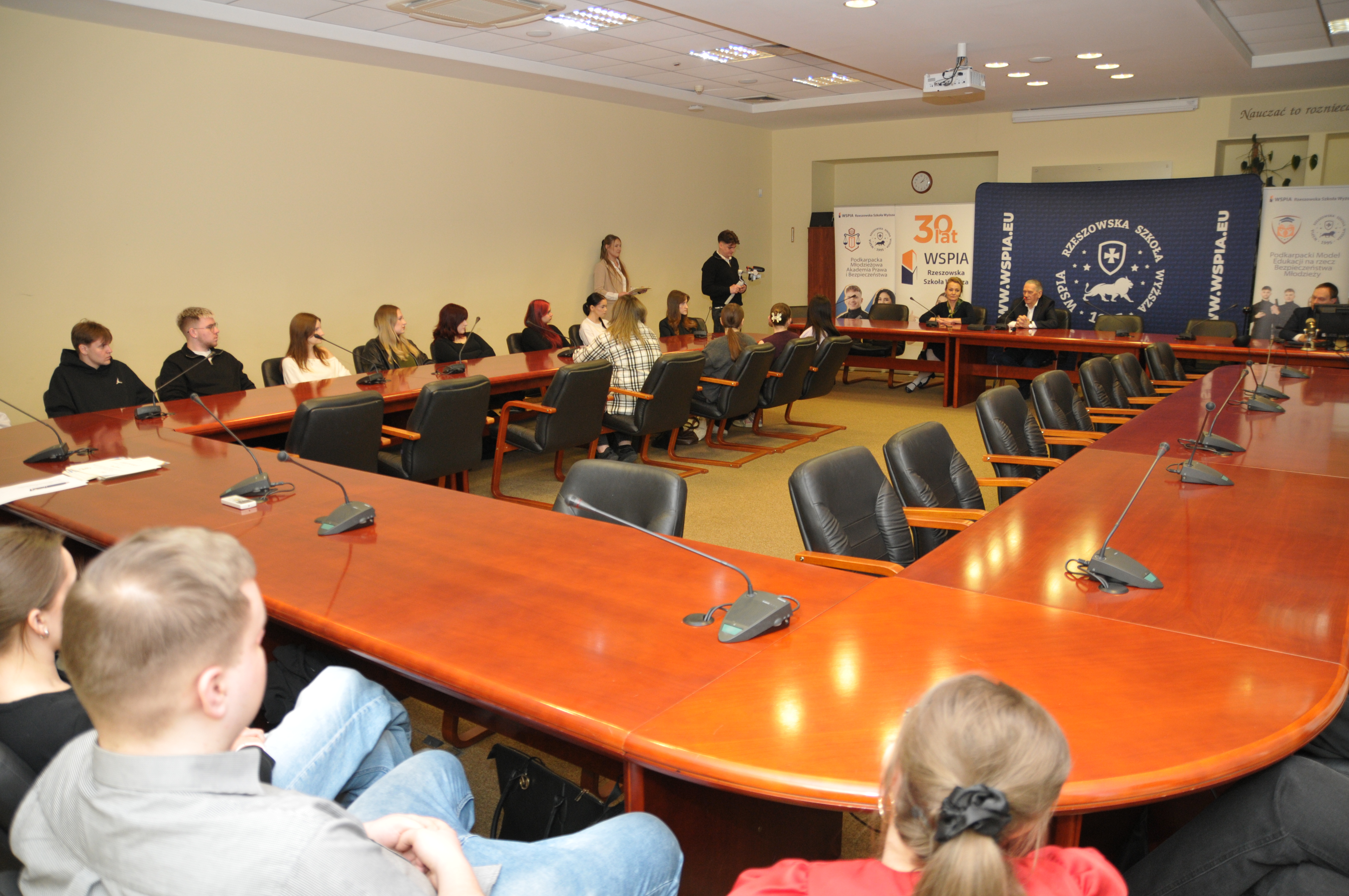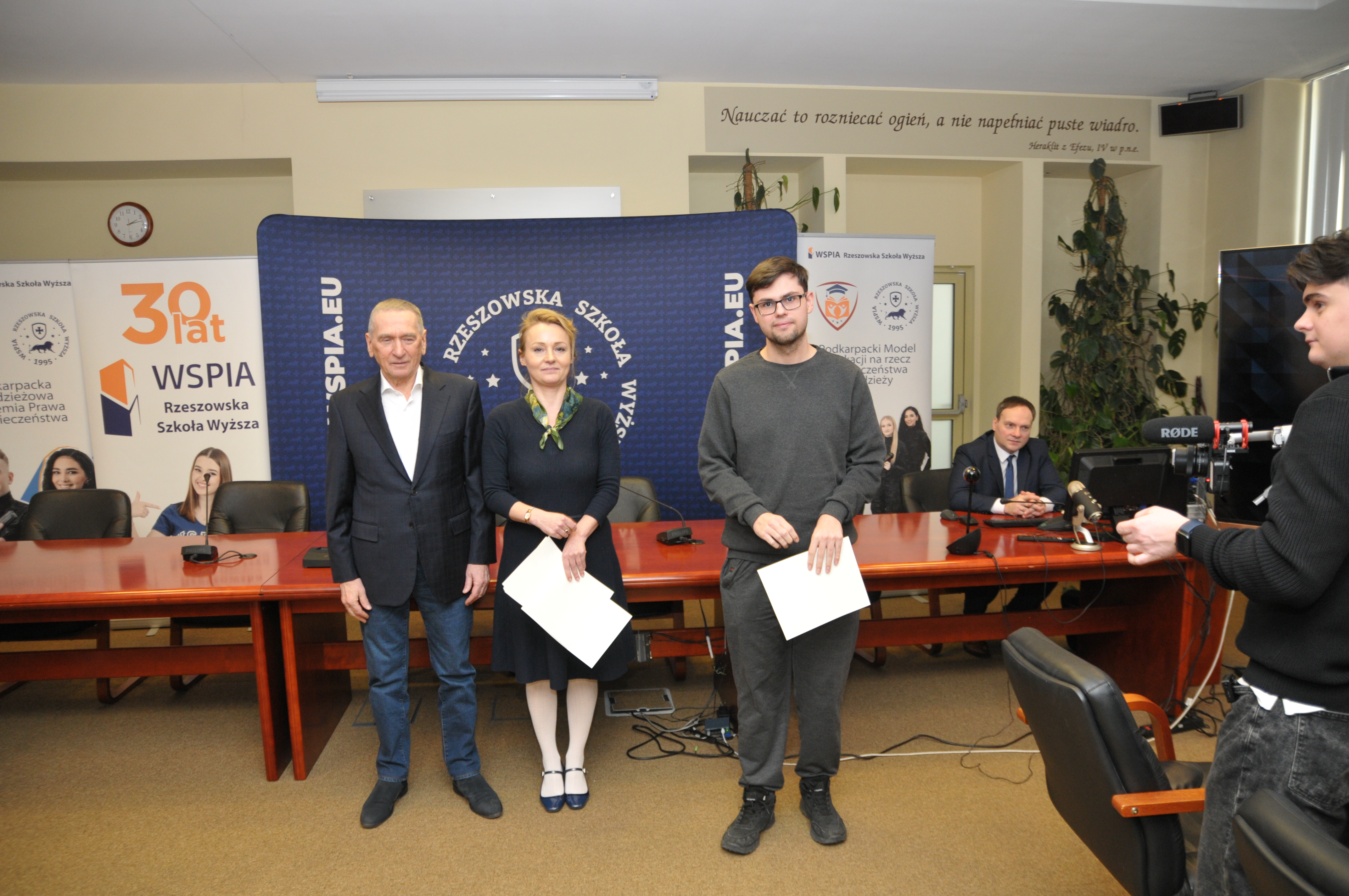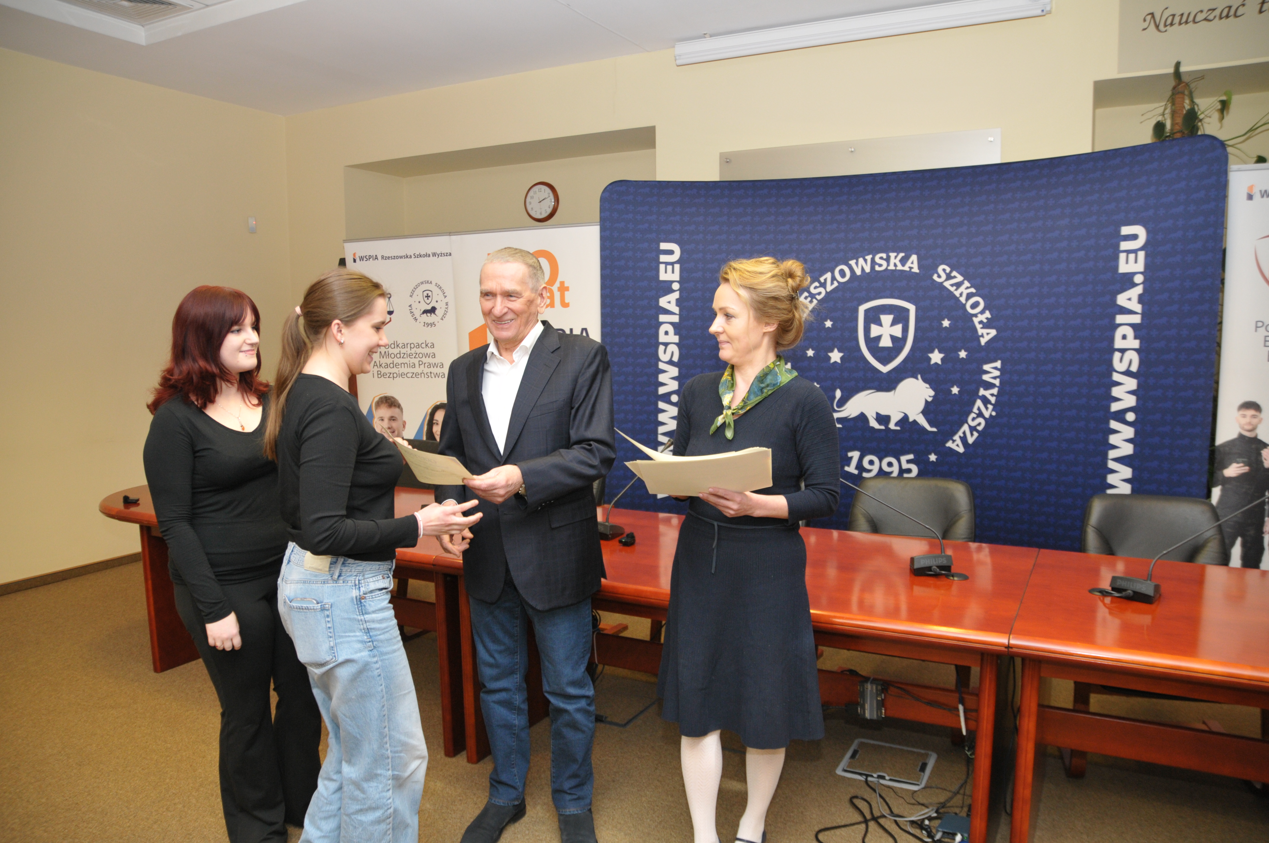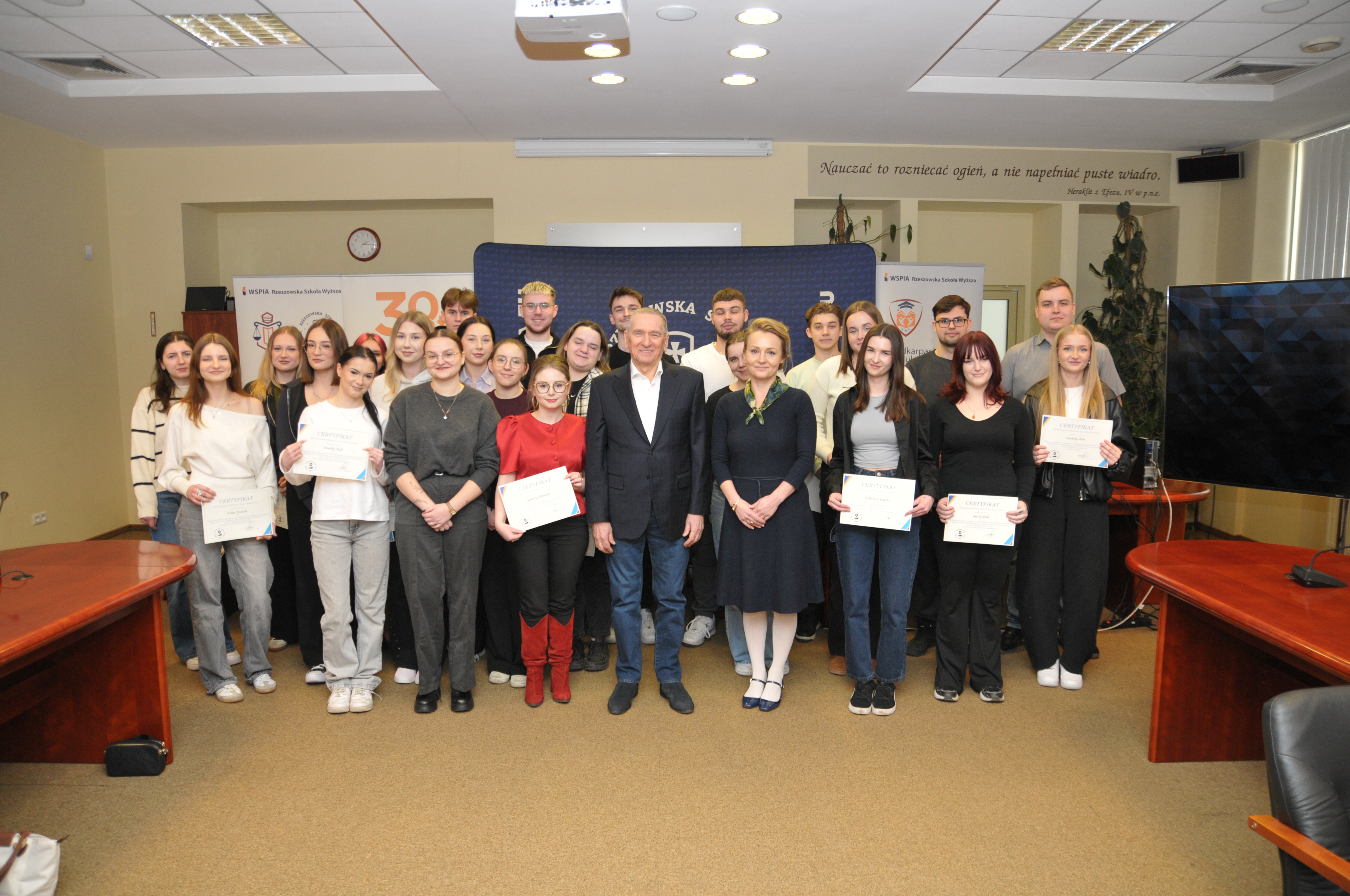 26 lutego 2026 roku w murach Wyższej Szkoły Prawa i Administracji w Rzeszowie odbyła się uroczystość podsumowująca XII edycję Podkarpackiego Młodzieżowego Święta Bezpieczeństwa. Podczas spotkania Rektor WSPiA, prof. dr hab. Jerzy Posłuszny, wręczył studentom certyfikaty potwierdzające ich zaangażowanie oraz wkład w organizację tego prestiżowego wydarzenia.
