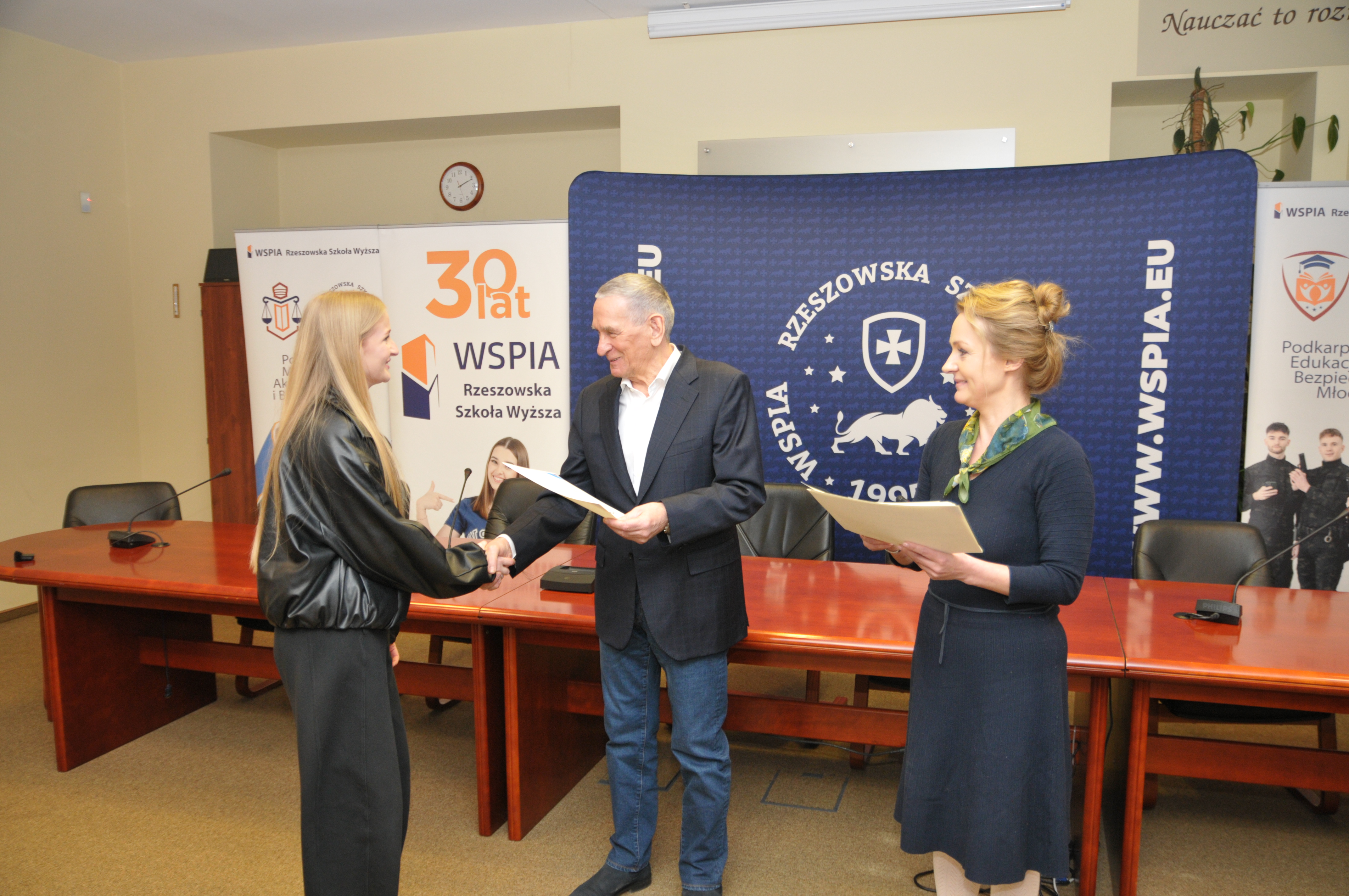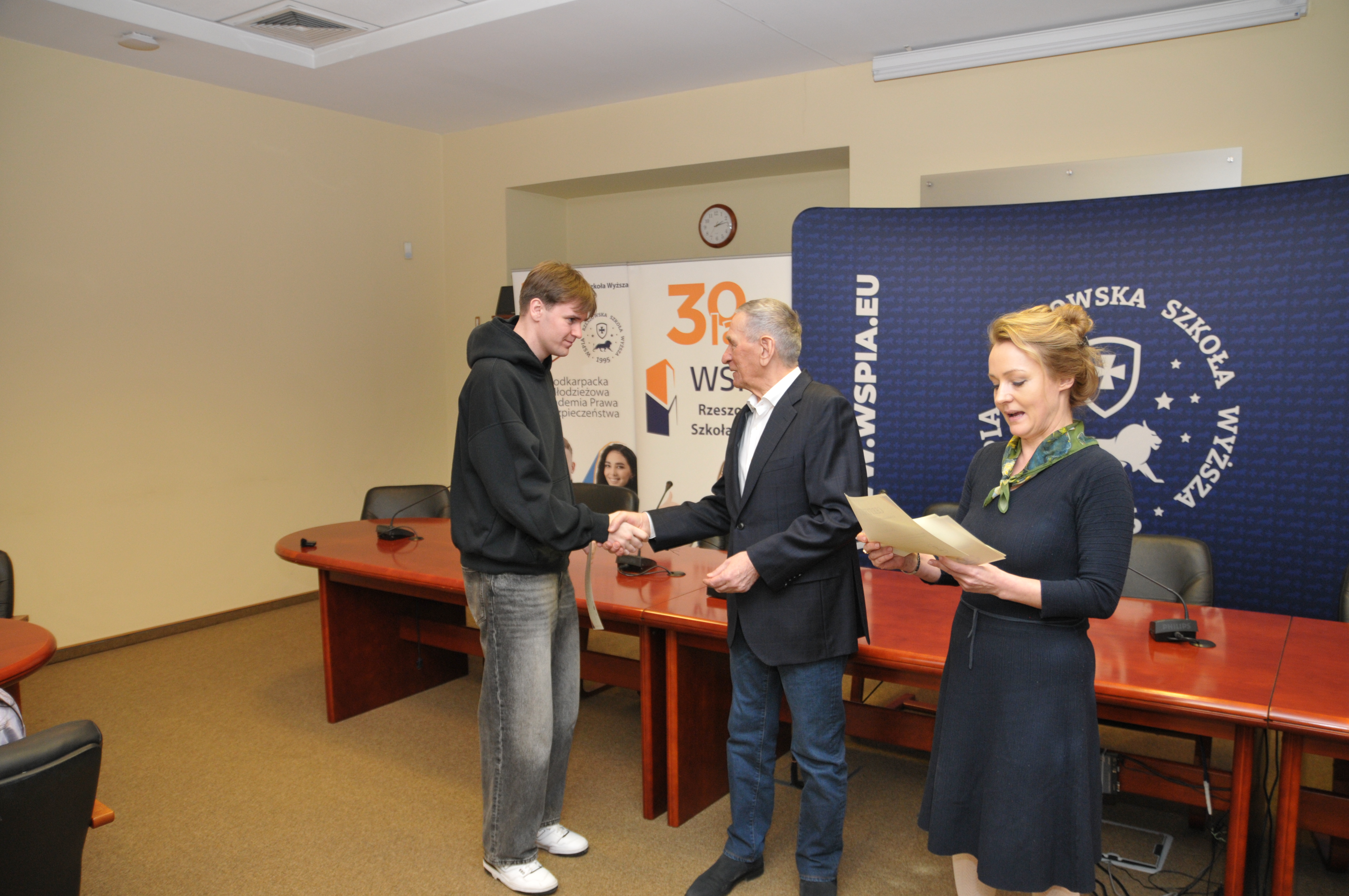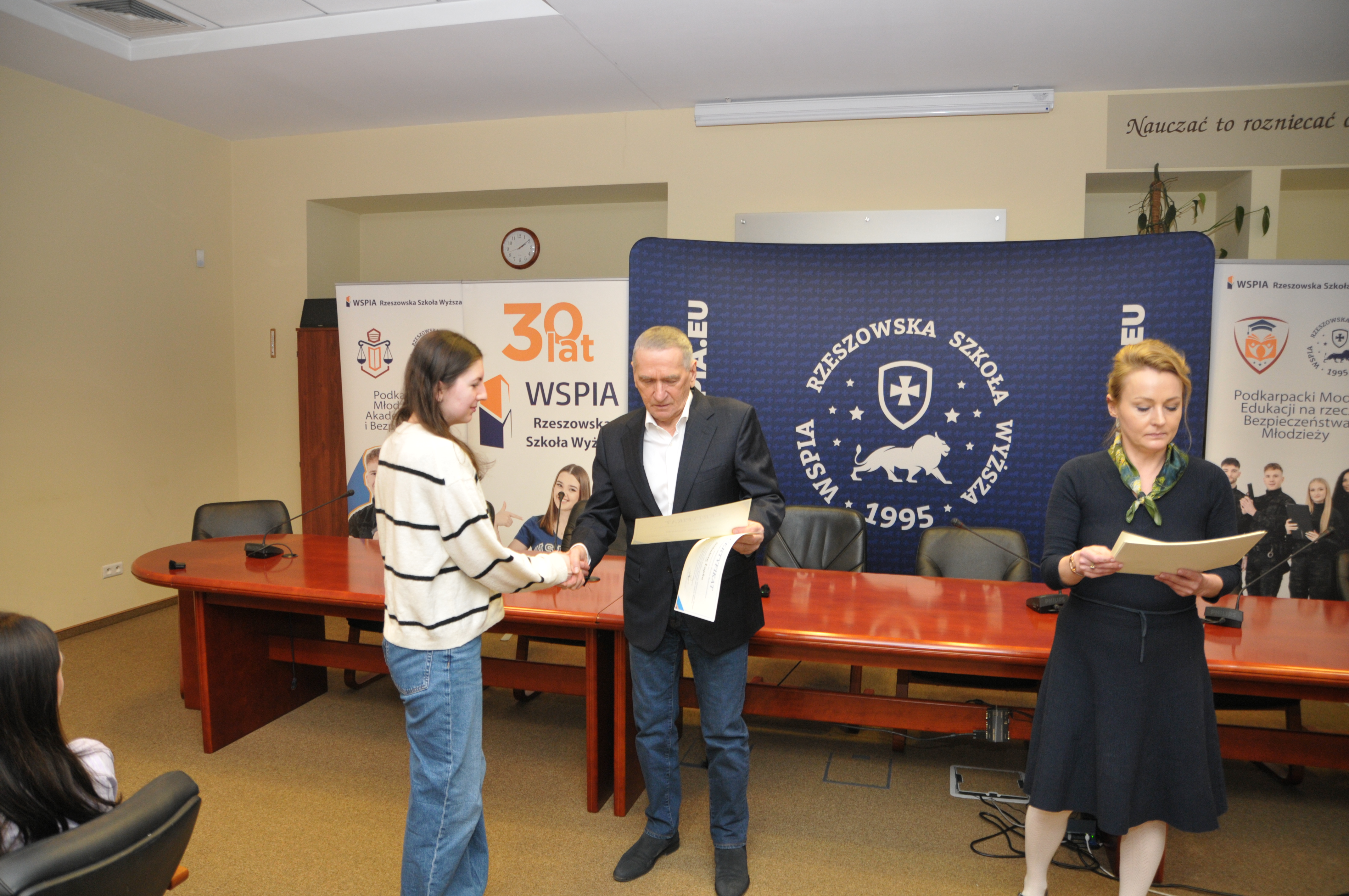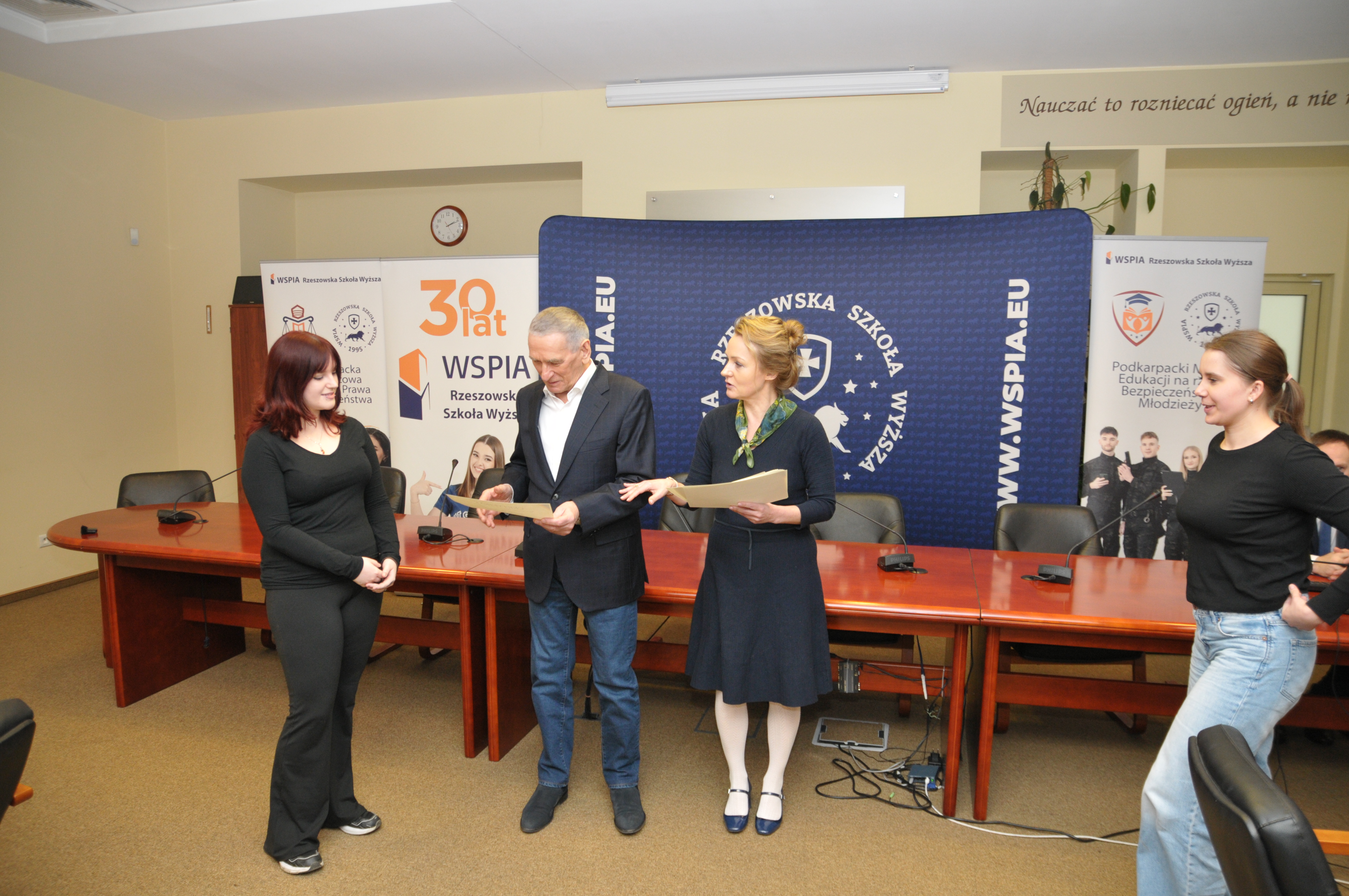 Rektor WSPiA prof. Jerzy Posłuszny złożył na ręce studentów certyfikaty świadczące o czynnym zaangażowaniu w organizację XII Podkarpackiego Młodzieżowego Święta Bezpieczeństwa. To wyraz uznania dla ich pracy, a jednocześnie podkreślenie roli młodego pokolenia w budowaniu kultury bezpieczeństwa.