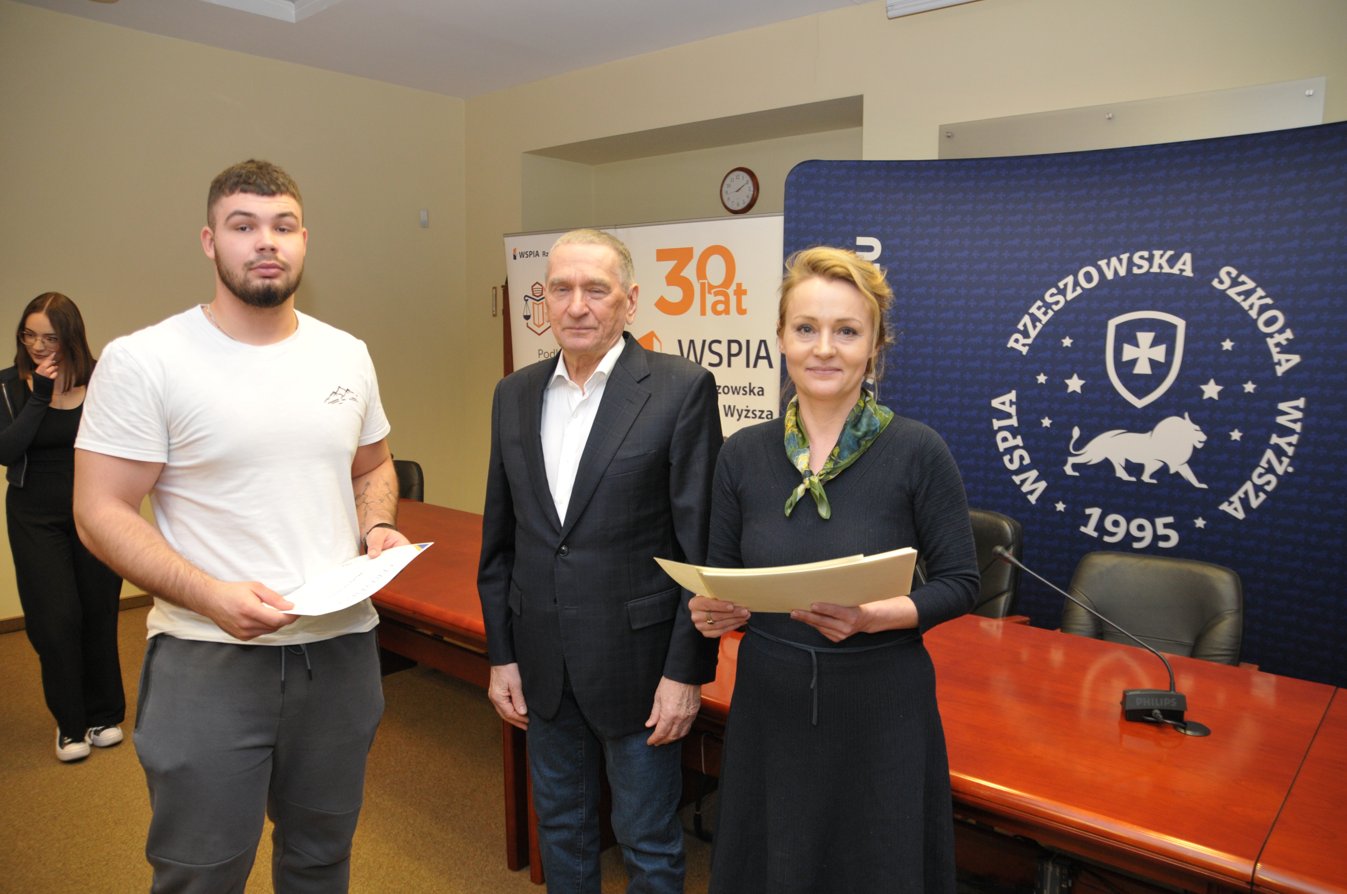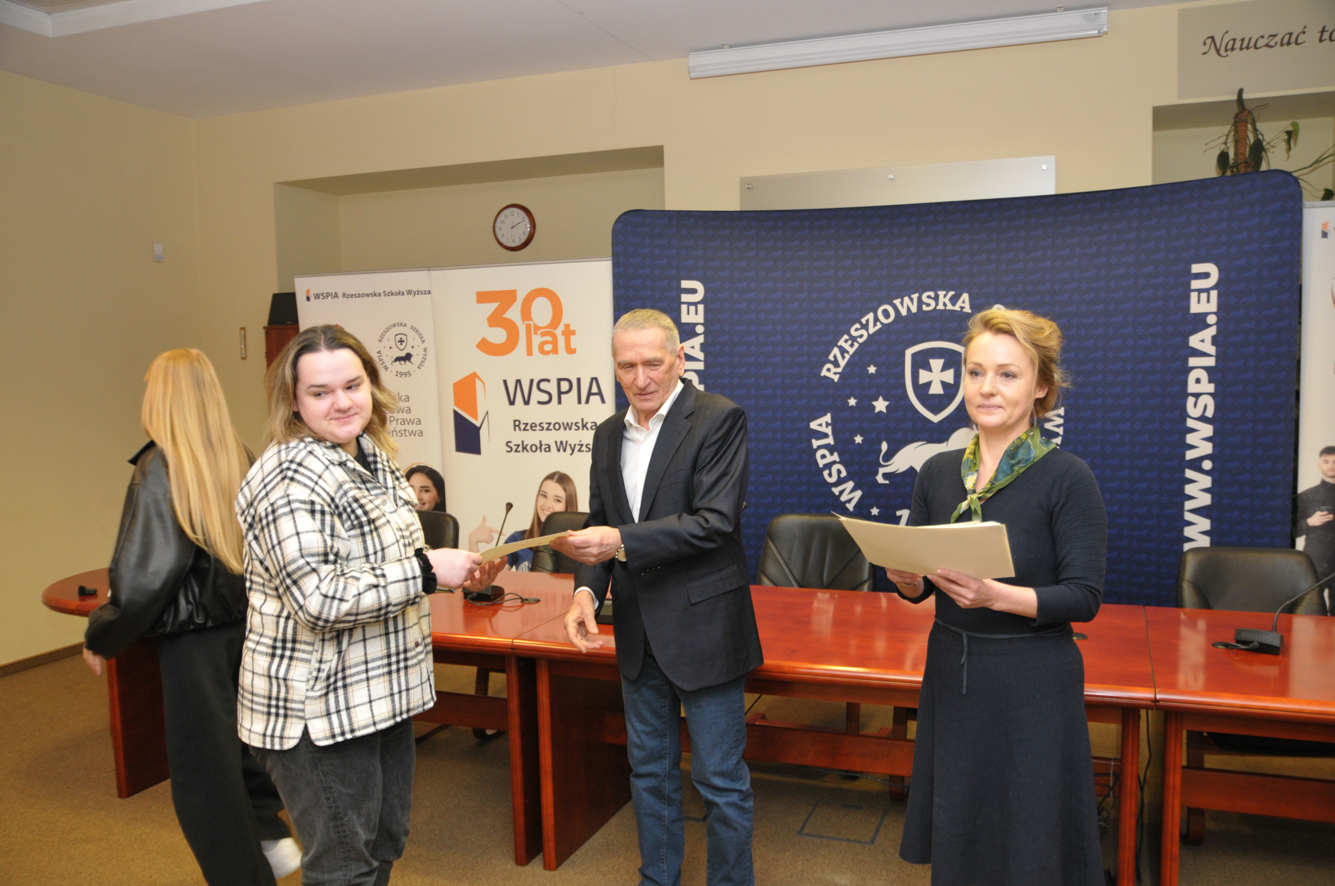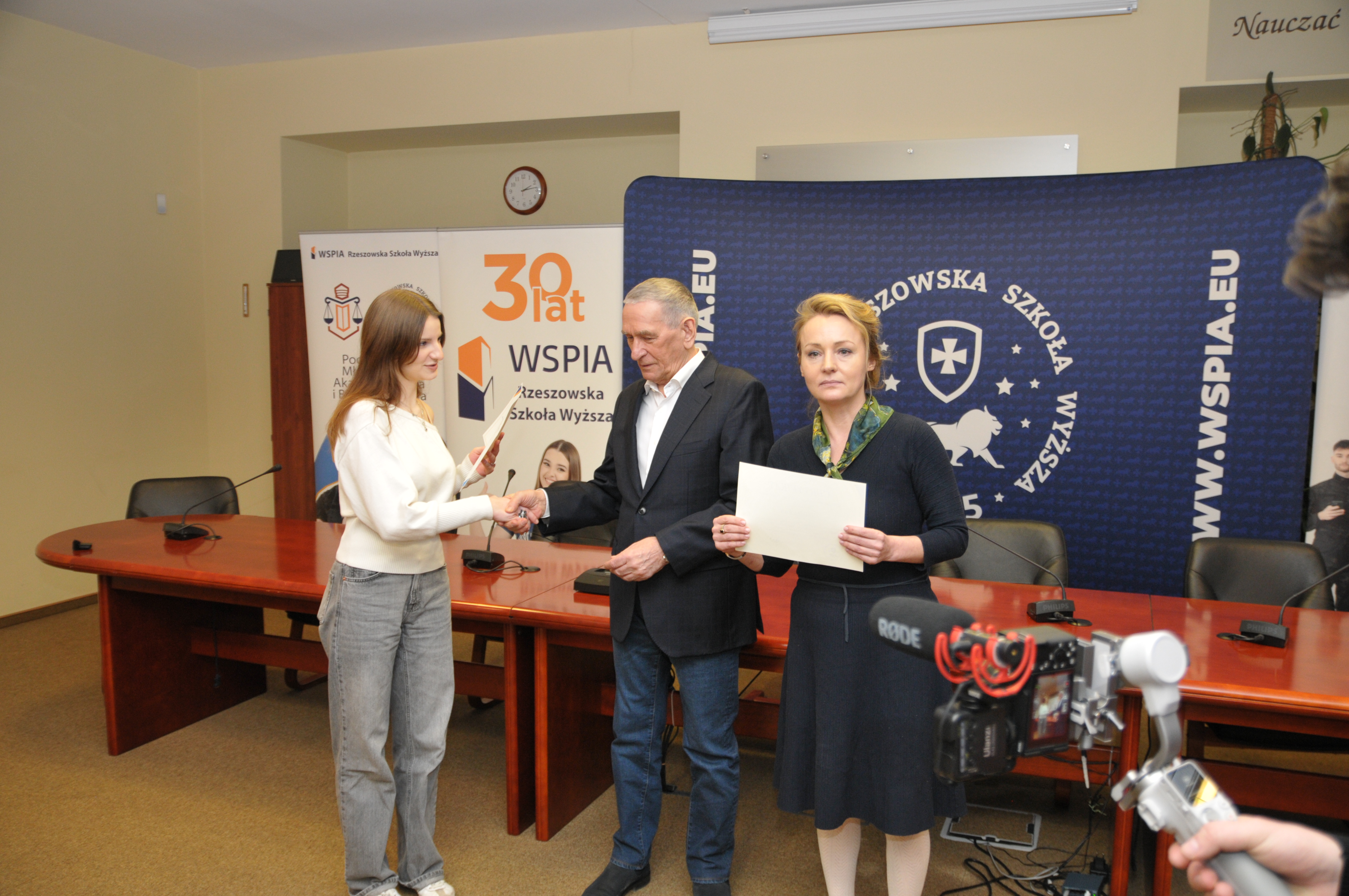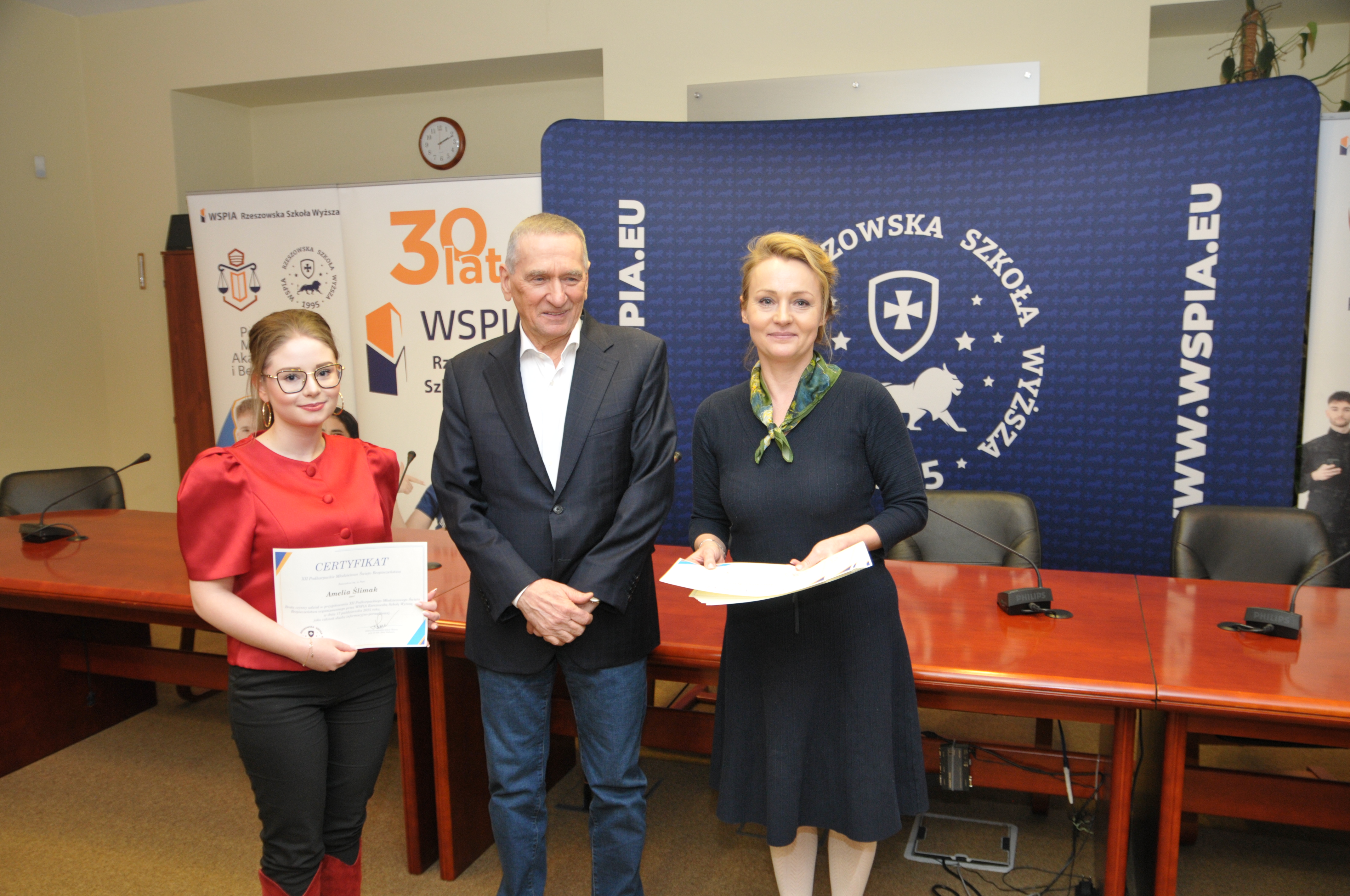 Rektor WSPiA prof. Jerzy Posłuszny złożył na ręce studentów certyfikaty świadczące o czynnym zaangażowaniu w organizację XII Podkarpackiego Młodzieżowego Święta Bezpieczeństwa. To wyraz uznania dla ich pracy, a jednocześnie podkreślenie roli młodego pokolenia w budowaniu kultury bezpieczeństwa.