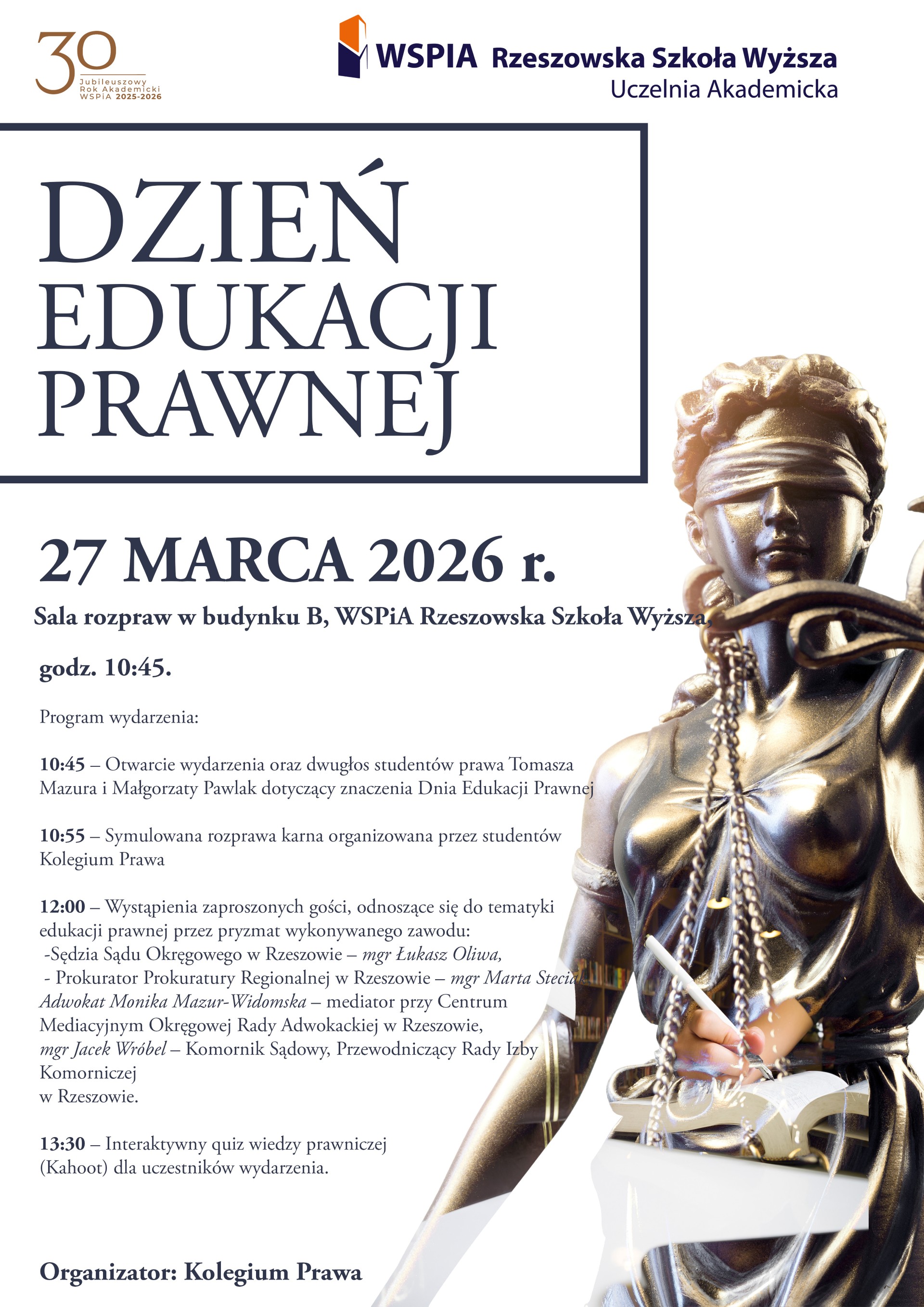 Dzień Edukacji Prawnej w WSPiA stanowi istotny element kształcenia praktycznego studentów oraz wpisuje się w realizowaną przez Uczelnię ideę łączenia teorii z praktyką. Inicjatywa sprzyja również wzmacnianiu współpracy ze środowiskiem prawniczym regionu oraz budowaniu przestrzeni do wymiany doświadczeń między studentami a przedstawicielami zawodów prawniczych.