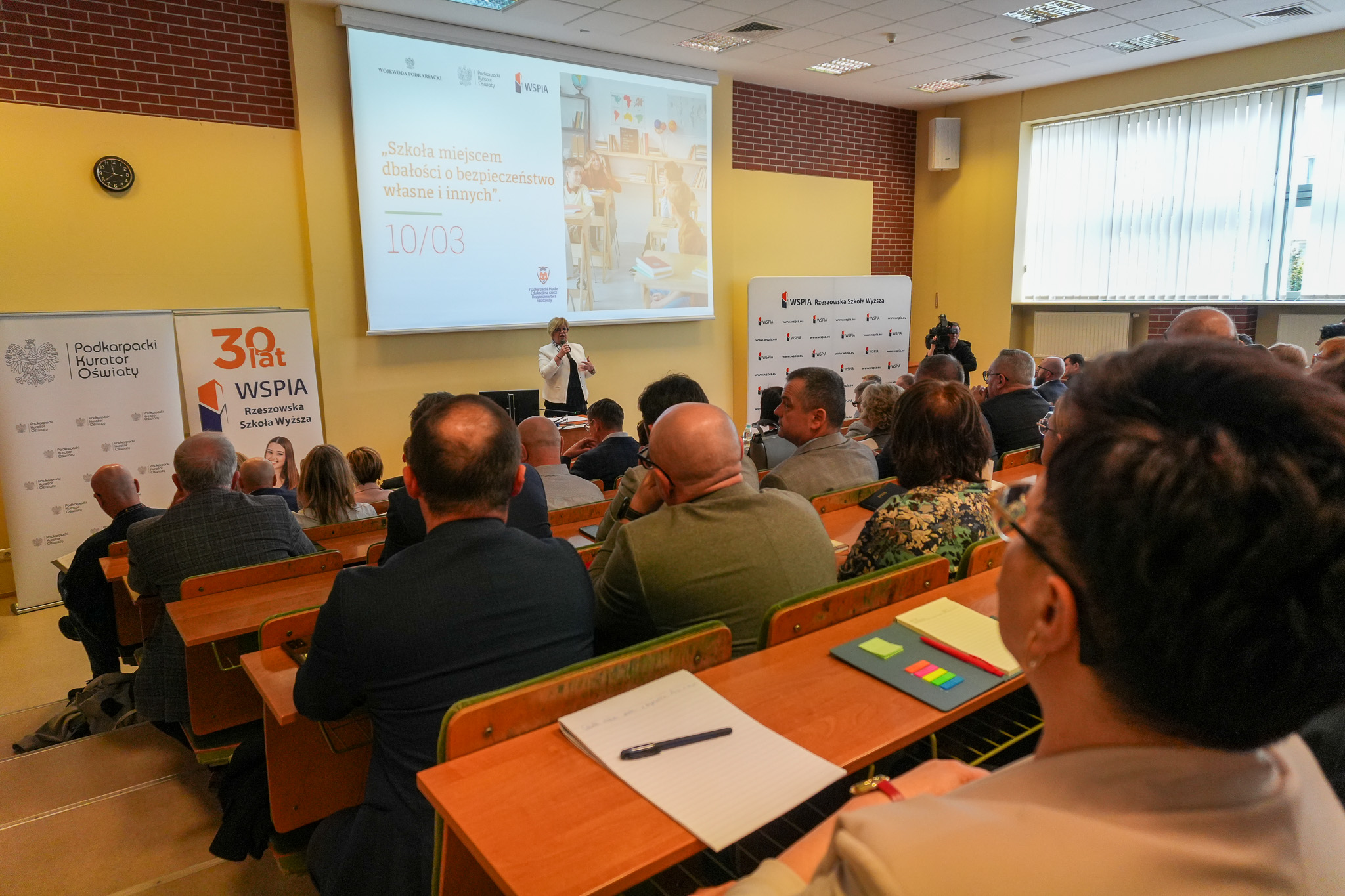 Blisko 300 dyrektorów szkół podstawowych i samorządowcy spotkało się w WSPiA Rzeszowskiej Szkole Wyższej, aby rozmawiać o nowych obowiązkach wynikających z ustawy o ochronie ludności i obronie cywilnej. Szkolenie pt. „Szkoła miejscem dbałości o bezpieczeństwo własne i innych” zorganizowane zostało przez Wojewodę Podkarpackiego, Podkarpackie Kuratorium Oświaty oraz WSPiA Rzeszowską Szkołę Wyższą w ramach Podkarpackiego Modelu Edukacji na rzecz Bezpieczeństwa Młodzieży.