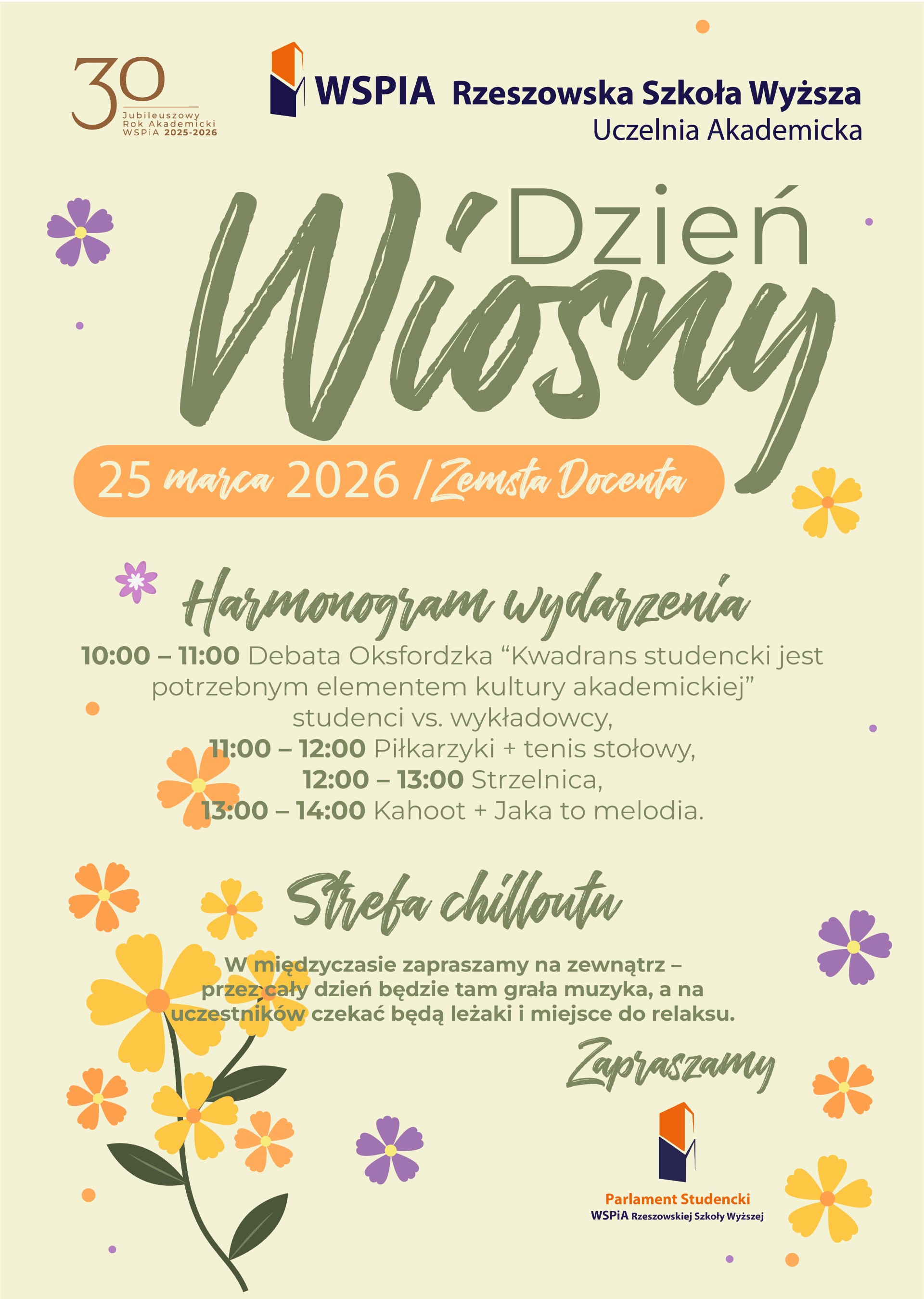 Pierwszy dzień wiosny powinno się świętować z przytupem – i Parlament Studencki WSPiA zadbał o to, by i u nas nie zabrakło fajerwerków. Już 25 marca 2026 roku w murach naszej Uczelni odbędzie się wielkie święto wiosny. Harmonogram wydarzenia obejmuje: