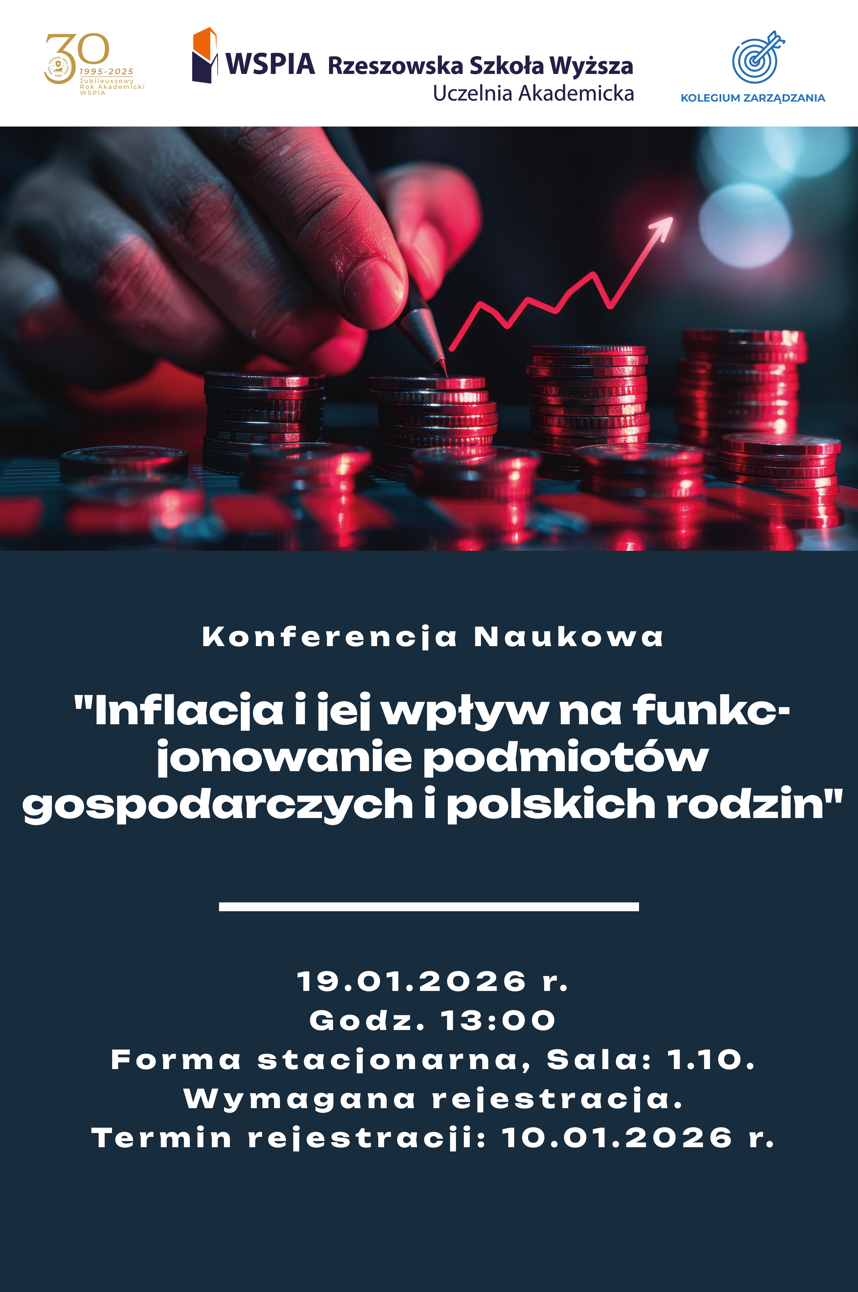 - 19 stycznia 2026, 13:00 - Konferencja Naukowa "Inflacja i jej wpływ na funkcjonowanie podmiotów gospodarczych i polskich rodzin" organizowana przez Kolegium Zarządzania WSPiA, Forma stacjonarna, Sala: 1.10. (Wymagana rejestracja do 10.01.2026 r.)